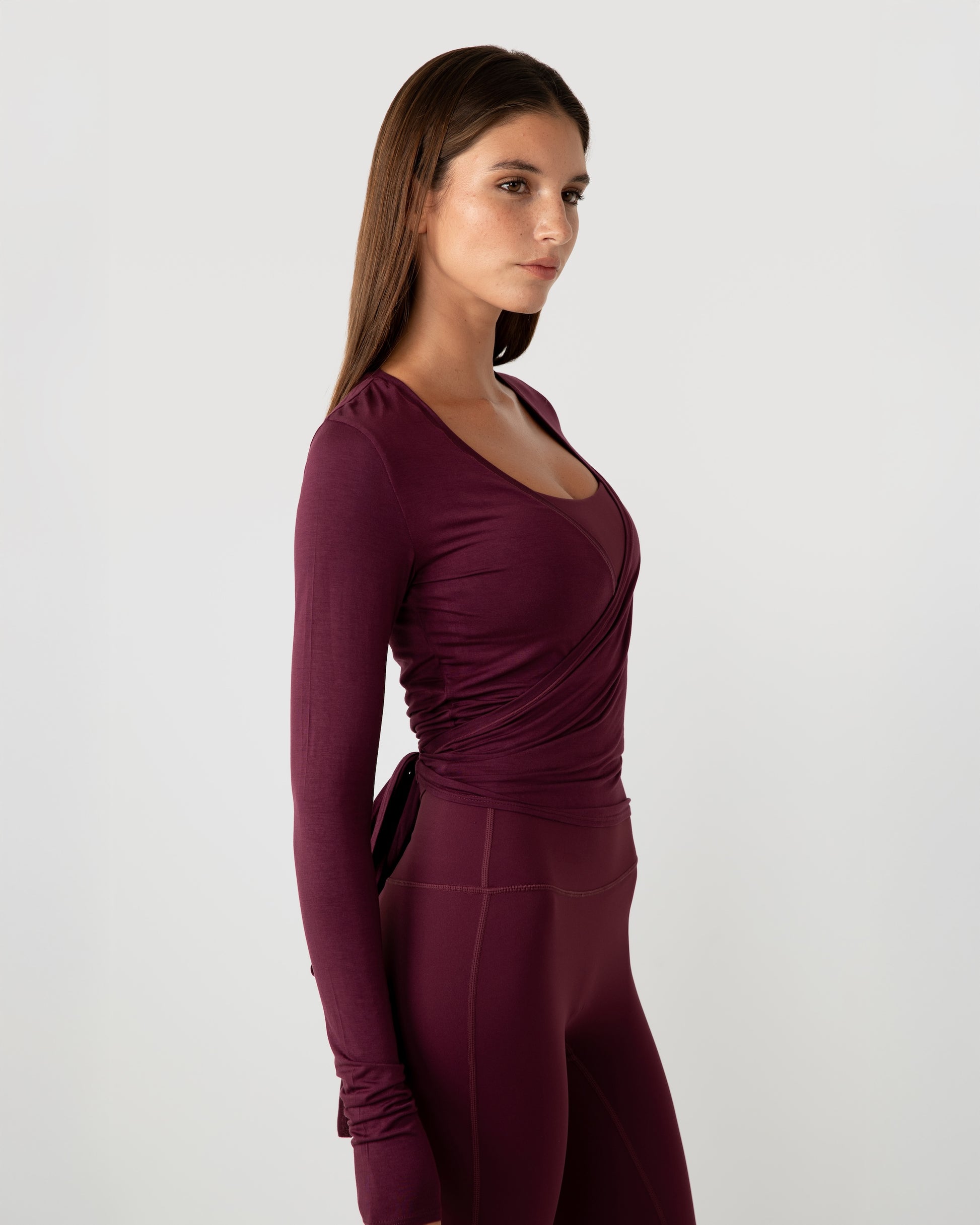 Med en premiumblanding af 65% Rayon, 30% Acrylic og 5% Spandex falder stoffet smukt og følger dine bevægelser. Wrap-designets bindebånd i taljen giver en personlig pasform og fremhæver overkroppen. De lange ærmer tilføjer et elegant udtryk og gør den ideel over en YO-GAYA bra eller top.